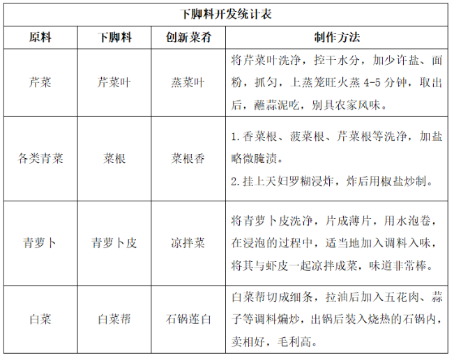 厨房可以做《下脚料开发统计表》,将所有的下脚料登记造册,对其进行菜肴创新。